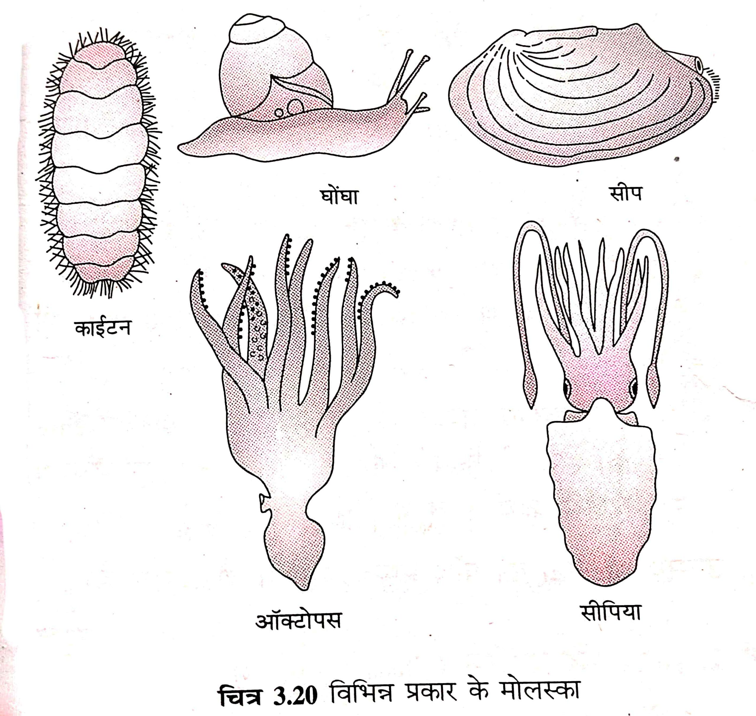 (vi) इसका उदाहरण – काइटन, घोंघा, सीप, ऑक्टोपस, सीपिया