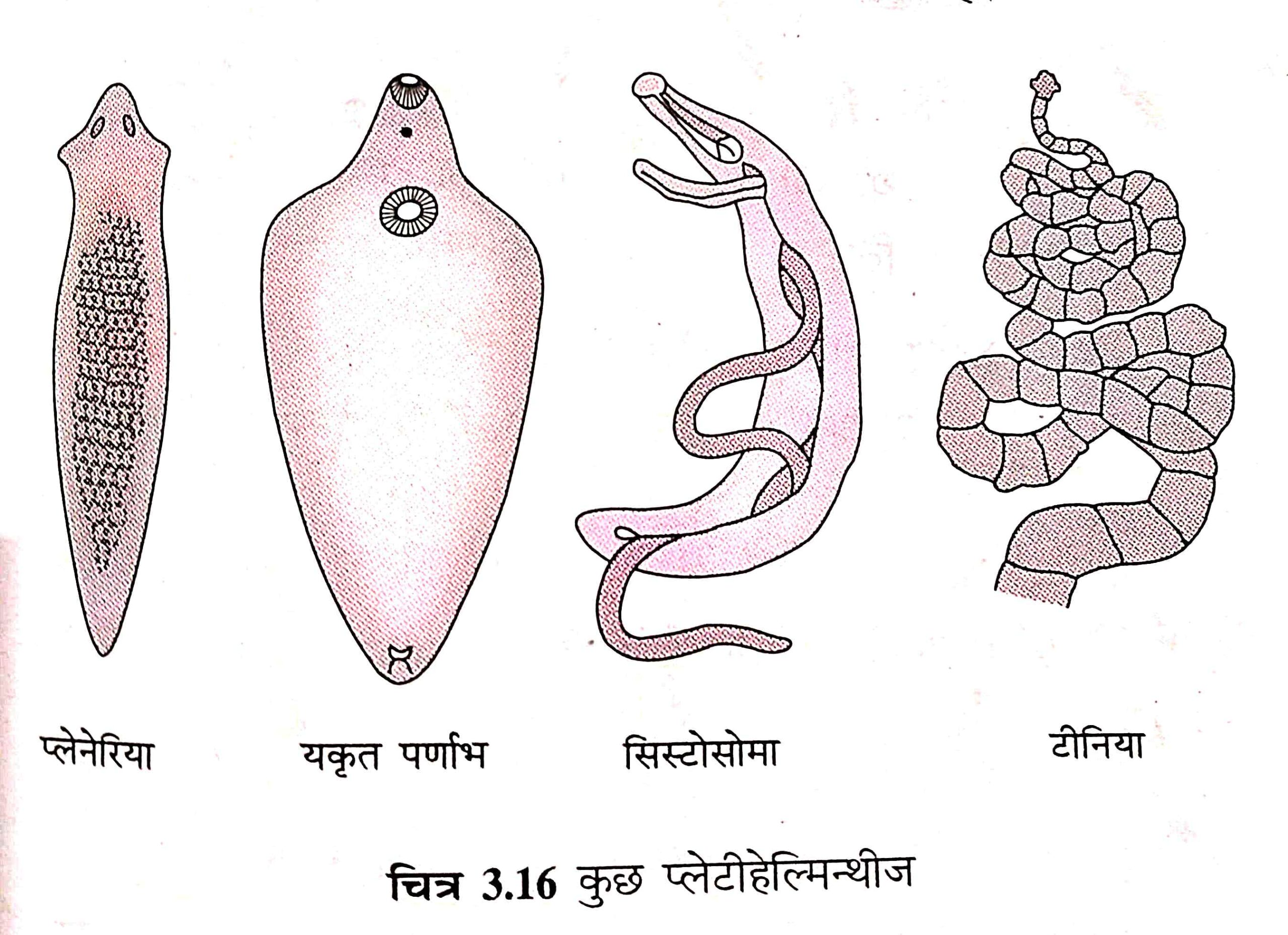(vi) उदाहरण: प्लेनेरिया, टीनिया, सिस्टोसोमा, यकृत पर्णाभ। इनमें प्लेनेरिया स्वतंत्रजीवी तथा अन्य परजीवी हैं।