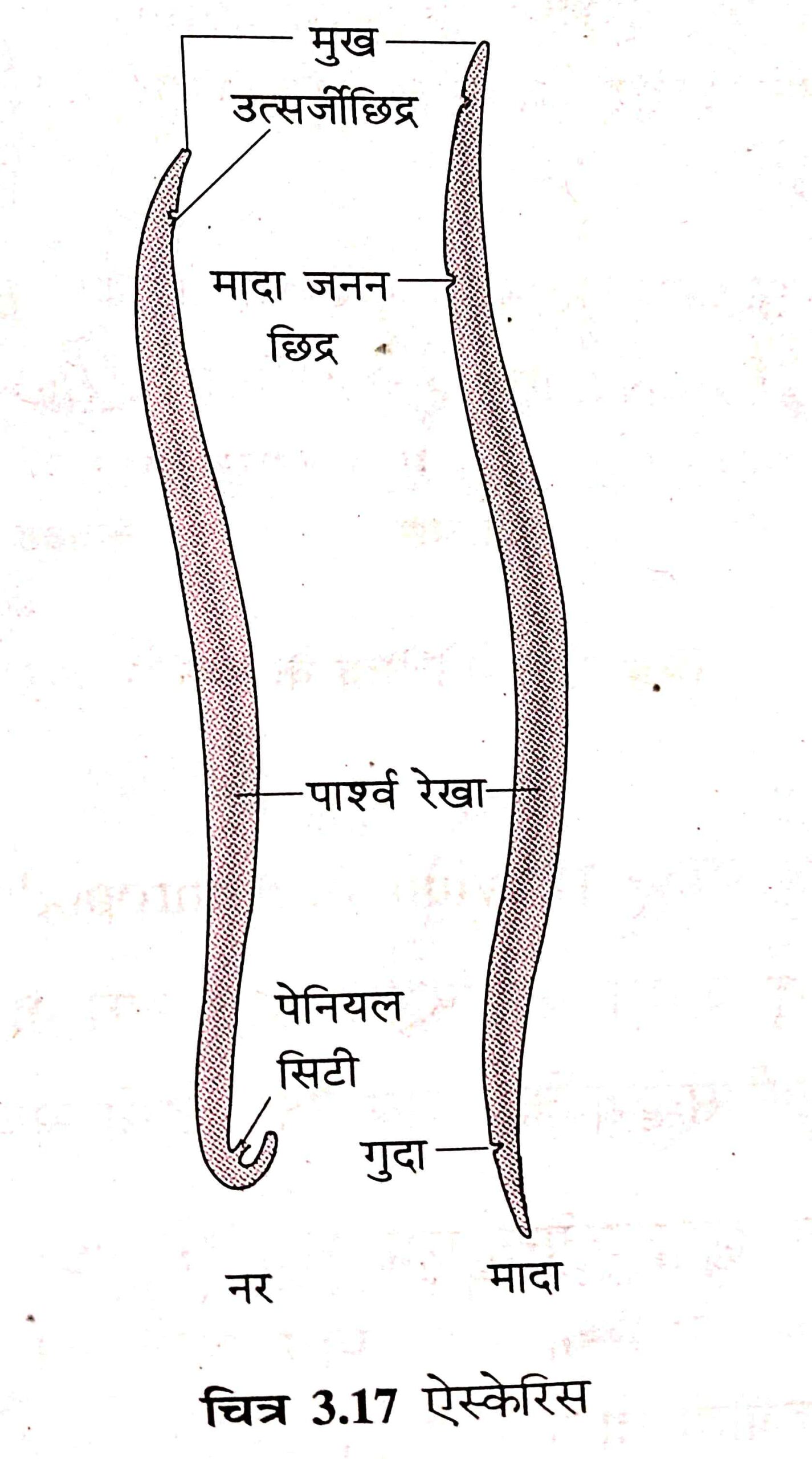 (v) ये एकलिंगी होते हैं, यानी नर और मादा अलग-अलग शरीर में पाए जाते हैं। ये अधिकतर परजीवी होते हैं तथा मनुष्य व जानवरों में रोग फैलाते हैं। उदाहरण: ऐस्केरिस, हुकवर्म, पिनवर्म